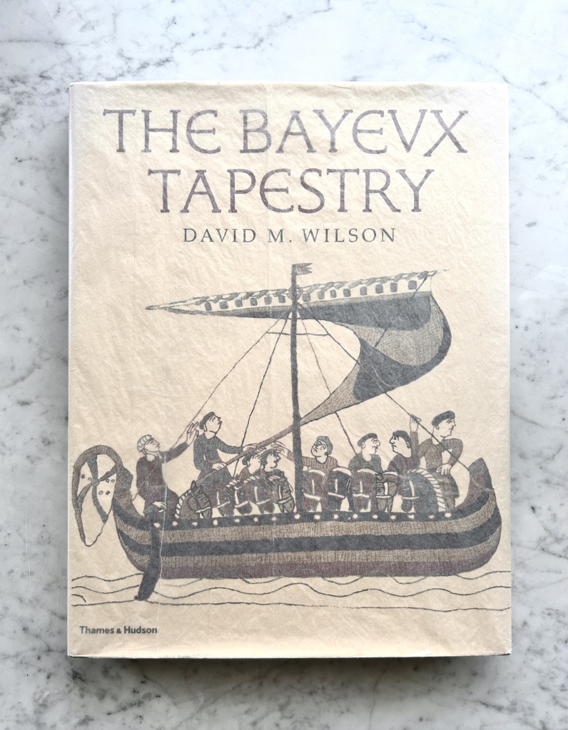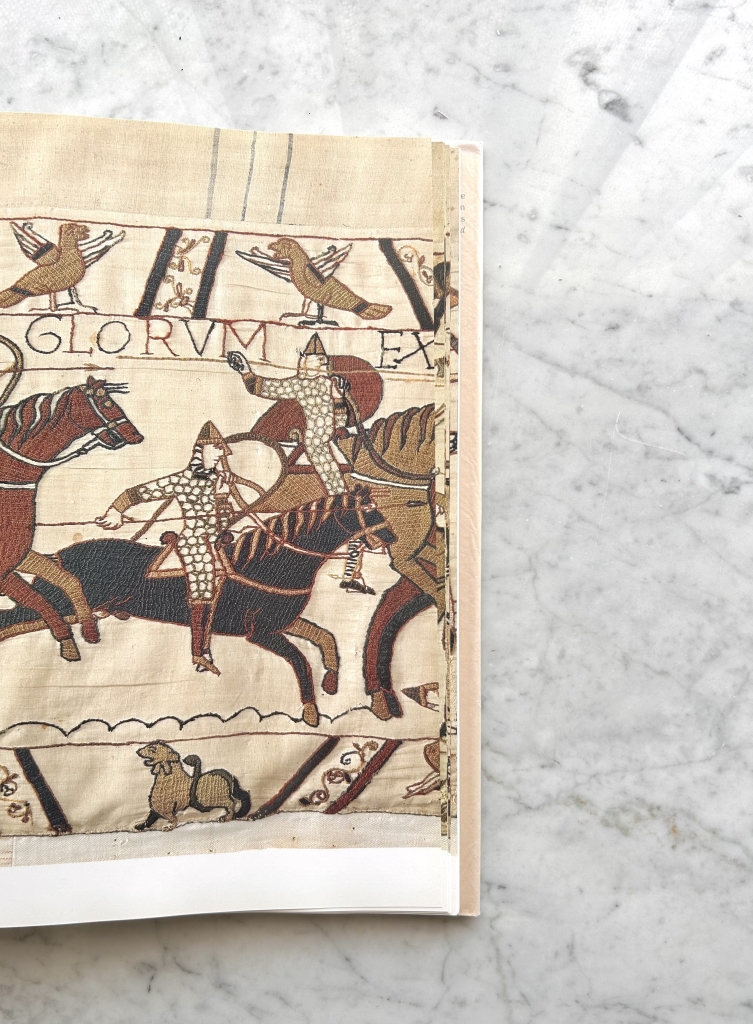 この『THE BAYEUX TAPESTRY』はその刺繍のすべてをおさめた大判の本で、丁寧なライティングで撮られた写真によりステッチの一つ一つの交差するさままで見ることができる。兵士のかたびらのための複雑なステッチ、馬の色を青色、黄土色、弁柄色の糸で刺しこめたステッチ、ラテン語のアルファベットのフォントのためのステッチ。