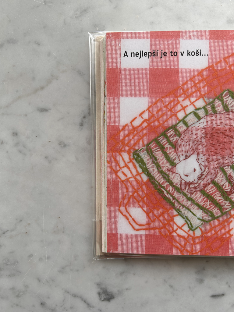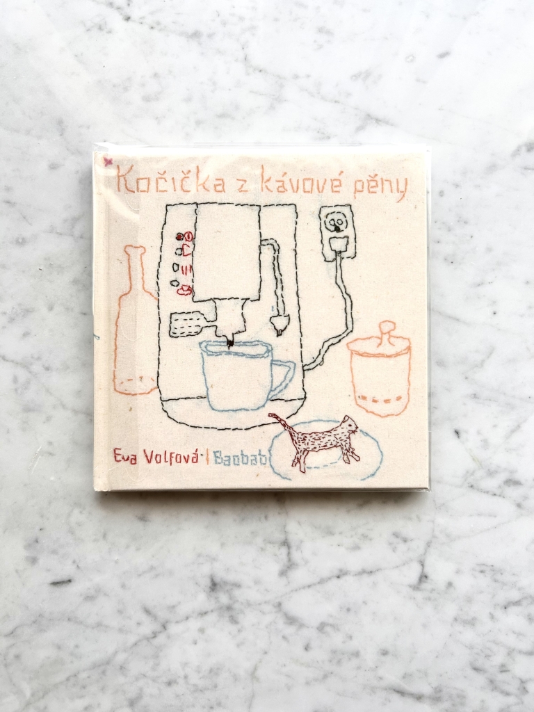 そこで出会った刺繍(絵本の原画)に激しく心を揺すぶられた。チェコの作家エヴァ・ヴォルフォヴァーの作品『Kočička z kávové pěny(コーヒーの泡から生まれたこねこ)』だ。アップリケを含む刺繍の技法で全ページが作られている。