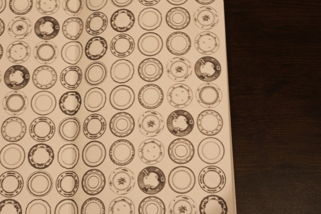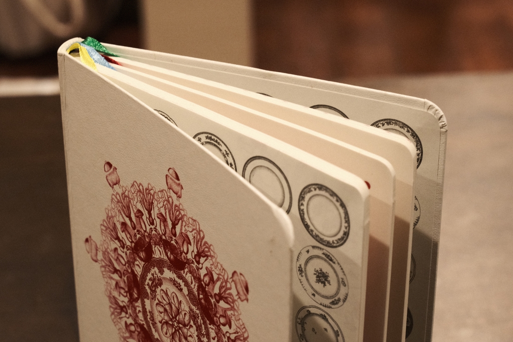 あまり大判ではない縦長の判型で、表紙はアイボリーホワイトに赤一色で印刷されている。テキストのタイトルと、大きくワンポイントで、曼荼羅というか花というか、そんな大ぶりのシンボルがデザインされていた。見返しには、プラナカンやコロニアルなど、さまざまな時代と風土を反映した文様で飾られたお皿のイラストが一面に並んでいる。