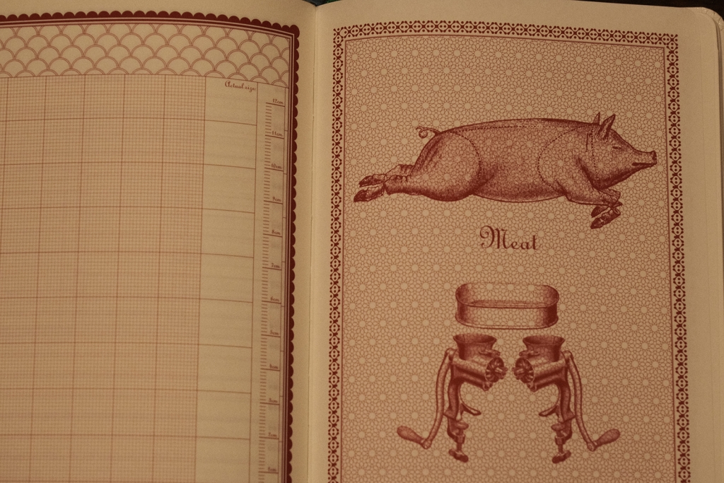 中も表紙と同様、ちょっとした写真以外は赤一色印刷で、銅版画のような細密画風の挿絵に幾何学模様の背景、飾り罫とテキストで構成されている。特に面白いと思ったのがスピン(しおり紐)で、それぞれ色の違うスピンが4本もついていた。スープや前菜から、肉料理、魚料理、デザートまで、プラナカンのさまざまなレシピを、複数同時に参照するための工夫なのかもしれない。