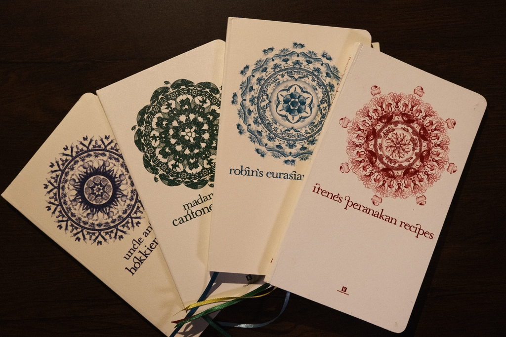 版元のサイトを調べていくうちにこのレシピブックを揃えたくなって、ほかに三冊ほど、福建、広東、ユーラシアン(ヨーロッパとアジアの混血の人たちのことだという)のものを購入してみた。南インド料理のものは売り切れていた。それらはすべて同サイズの白い表紙に、本ごとにテーマカラーの一色で印刷され、スピンは博物館で買ったもの以外は1本だったけれど、デザイン的に統一されたシリーズだった。よく見ると曼荼羅か花模様だと思っていた表紙のデザインは、料理に使われている食材の絵を連続させて用いた幾何学模様だと気がついた。