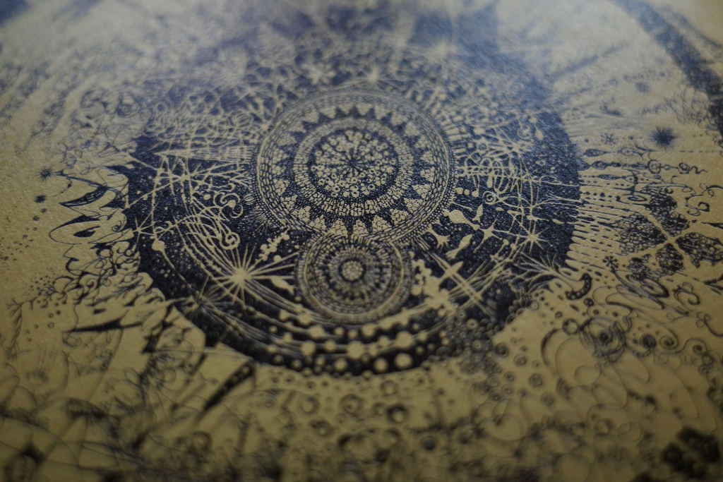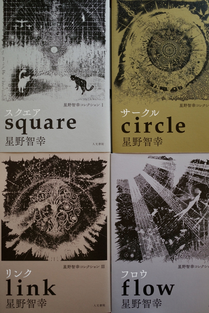 本そのものがアートになったケースとしては、私の作品を選集にまとめてもらった人文書院の『星野智幸コレクション』4巻本もある。各巻の装画を手がけてくださったのは、知り合いの武盾一郎さん。1990年代に新宿段ボール村に絵を描き続けた伝説もお持ちのアーチスト。第2巻「サークル」の画像を拡大したものを見てほしい。細いボールペンだけで細密に描いていく幾何学的な絵は、それだけで一つの宇宙だ。四つの色違いの宇宙で銀河を作ってくださったのは、装幀家の藤田知子さん。読まなくてもいいからこの4巻はセットでそろえて本棚に置いて眺めてほしい、とさえ思う芸術品である。