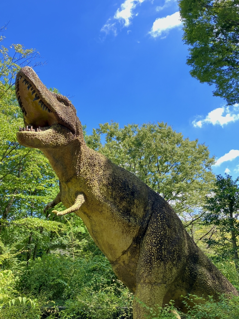 明治から昭和初期の民家や庁舎などが復元・移築されており、貴重な文化遺産をじっくりと楽しむことができます。とにかく広いので方向を見失いそうになりますが、水車小屋があったり、「水遊びの池」では子どもたちが歓声を上げていたりと、何とも幸せな空気に包まれた空間です。 しばらく歩いていると、目の前にティラノサウルスが!
