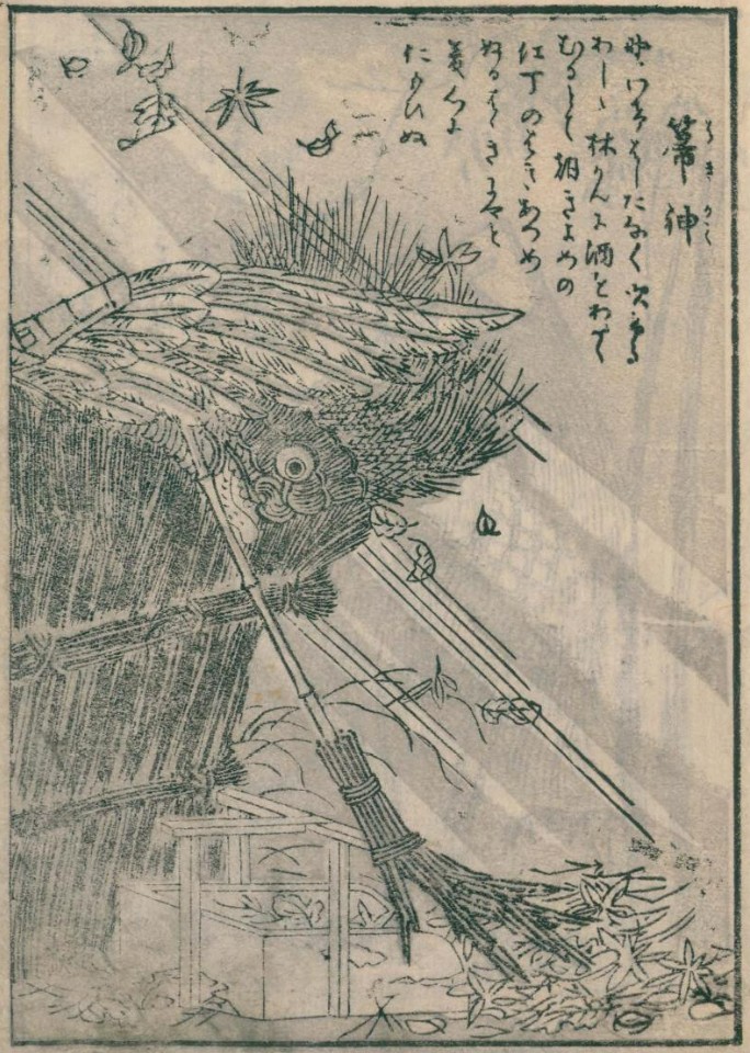 話をあの箒神に戻そう。ここまでのように箒という道具に眼差してみると、箒神の外見にはやはり掃除道具としての箒の意匠がふんだんに盛り込まれているのがわかる。垣根に手をかけているのは羽、つまり羽箒。目や鼻らしきものがついている頭にも見える部分は、棕櫚箒そのものだ。