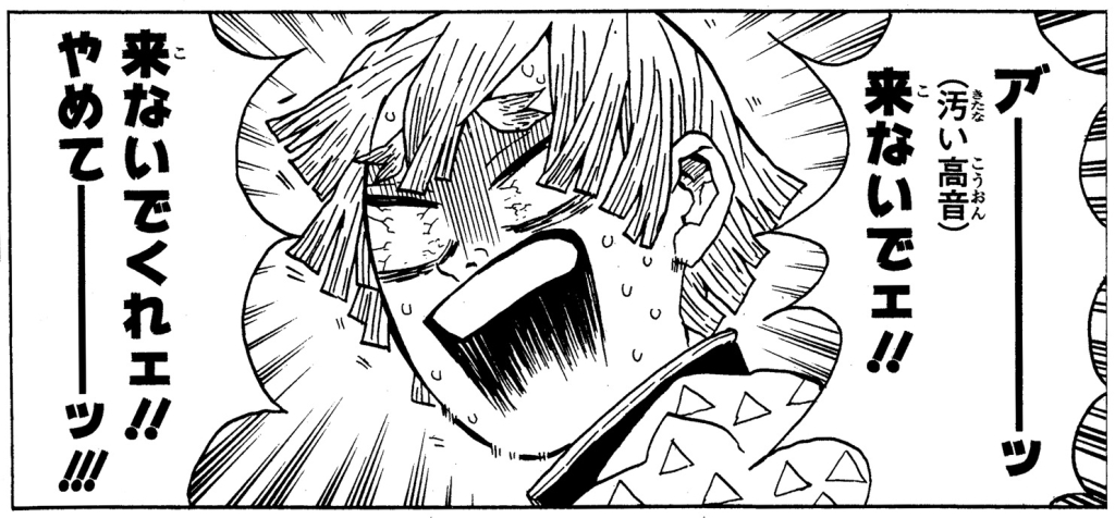 川原 そういう質問もでるかと思って、面白い例をもってきました。『鬼滅の刃』の3巻で善逸が登場する時のシーンです。「あ」に点々が付いてる。これはどんな音だと思う? 「汚い高音」ってちゃんと漫画に書いてあるんだけど、実際にはどんな音かな。